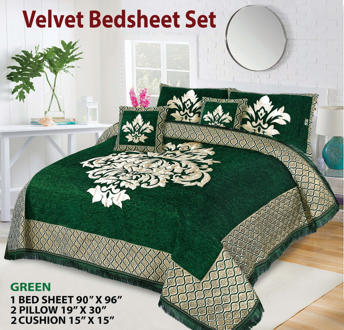 Green Crown Velvet Jacuard Bedsheet Set - 07
